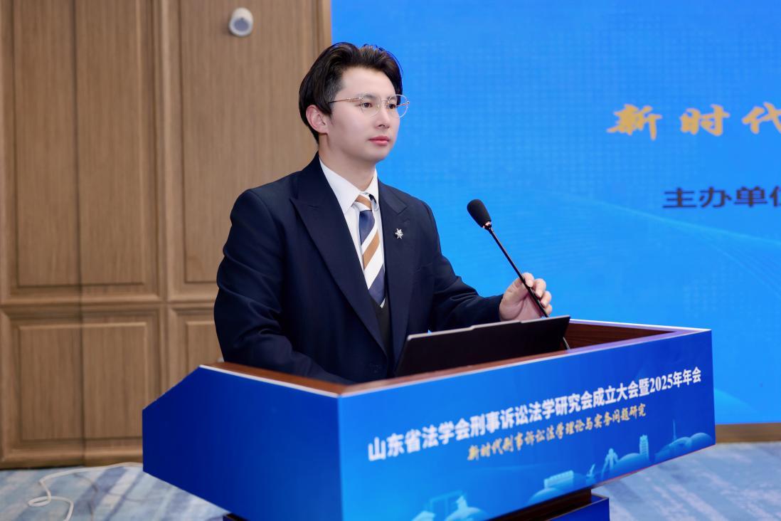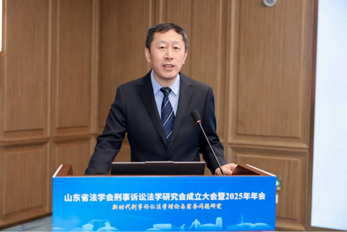 副校长张献勇、山东省高级人民法院党组成员、副院长江敦斌先后为成立大会致辞。山东省高级人民法院刑三庭法官助理崔永振代表筹备工作组向大会汇报了筹备工作及理事会组成情况。与会代表通过举手表决,选举侯勇为研究会会长,选举冯俊伟、宋振武、王静、杨晓静、贺小军、厉文清、鲁统富、张文汇、阚吉峰为研究会副会长,选举崔永振为研究会秘书长,选举胡常龙等30人为研究会常务理事,选举赵恒等45人为研究会理事。山东省刑事诉讼法学研究会新任会长、山东省高级人民法院刑三庭庭长侯勇作表态发言,山东省法学会党组成员、专职副会长兼秘书长孟斌发表主旨讲话。会议强调,成立刑事诉讼法学研究会是省法学会经过慎重考虑、认真研究作出的决定。研究会要聚焦打造国内一流学术平台目标,努力为刑事司法实践提供有力学理支撑和智力支持,赋能平安山东、法治山东建设。