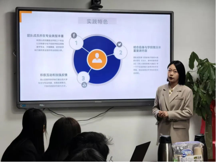 各团队的答辩人员通过PPT展示,详细介绍了实践活动的前期组织、实施过程、创新亮点、成果成效、反思建议等内容。青年学子们有的通过宣讲会分享大学生活,有的通过座谈会解答学弟学妹的疑惑,有的通过互动活动展现烟大风采。他们用实际行动践行了烟大精神,展现了新时代青年的责任与担当。