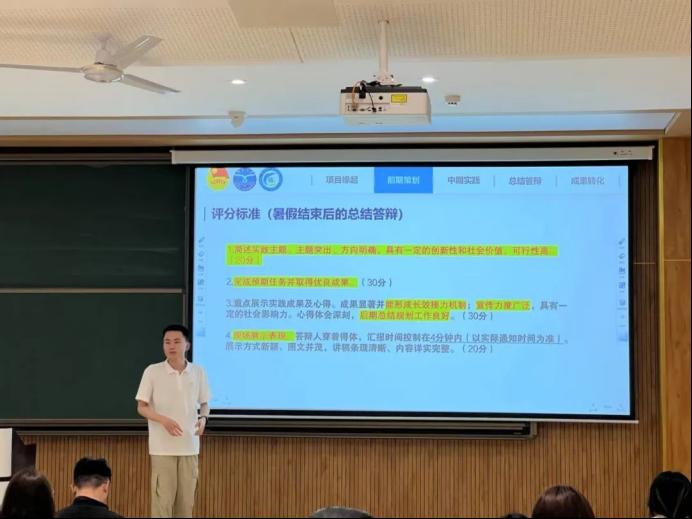 在南校区实训楼东区213举办暑期社会实践宣讲会。本次宣讲会由学院团委书记刘运正及社会实践优秀学生代表法221-1班翟子熠主讲,24级同学参与。
