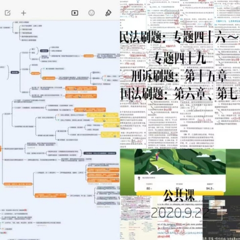 另一方面,当日学习的进度应当可视。每天睡前,我都会将今日学习的内容做成一张总结图片,辅助把控学习阶段。此举有效避免时间浪费,也会带来即时的成就感,增加学习动力。法考是一个全面夯实法学基础的契机,如果时间充足,建议将各科课程刷全,避免片面构筑的知识体系影响未来的学习。
