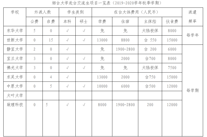 根据我校与台湾地区友好院校交流协议, 我校将于2019年9月选派全日制在校本科生或研究生作为交流生赴台湾高校学习研修,现将有关事项通知如下。
