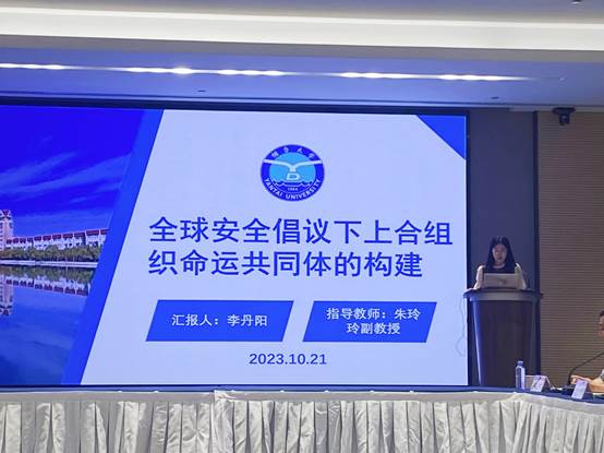 在读研究生李丹阳参与了会议第三环节“上合组织国际法治的安全保障研究”的主题研讨,并发表题为《全球安全倡议下上合组织命运共同体的构建》的学术报告。
