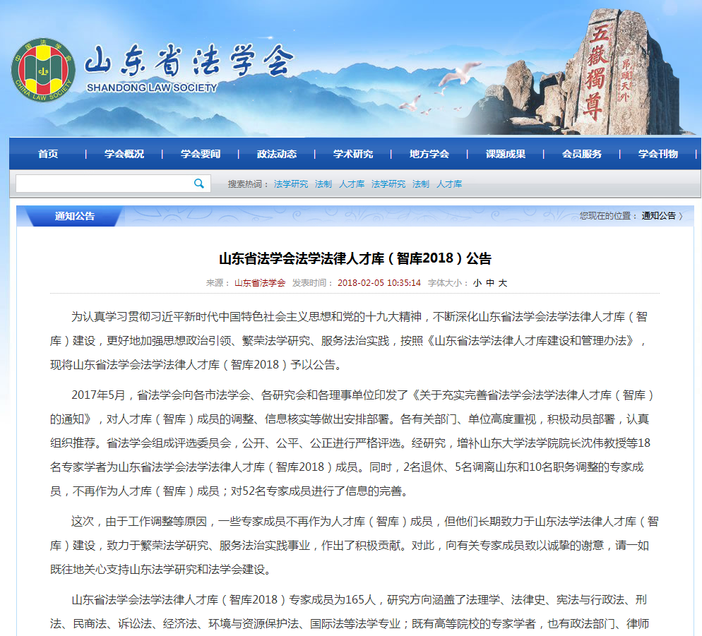 近日,山东省法学会公布了山东省法学会法学法律人才库(智库)专家名单,为认真学习贯彻习近平新时代中国特色社会主义思想和党的十九大精神,不断深化山东省法学会法学法律人才库(智库)建设,更好地加强思想政治引领、繁荣法学研究、服务法治实践,省法学会组成评选委员会,公开、公平、公正进行严格评选。最终确定山东省法学会法学法律人才库(智库2018)专家成员为165人,研究方向涵盖了法理学、法律史、宪法与行政法、刑法、民商法、诉讼法、经济法、环境与资源保护法、国际法等法学专业。尼克成人网