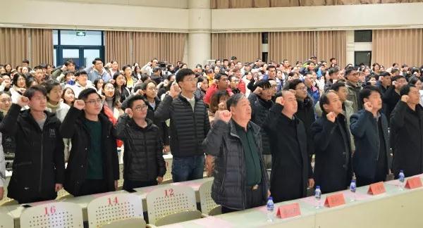 短片过后由四位同学带来了《宪法在心中》诗歌朗诵,随后由朗诵人员领诵进行宪法宣誓环节,现场的老师、同学紧握右拳,倾吐誓言字句铿锵,振奋有力,展现了在场宣誓人捍卫宪法精神,忠于祖国、忠于人民的坚定决心。