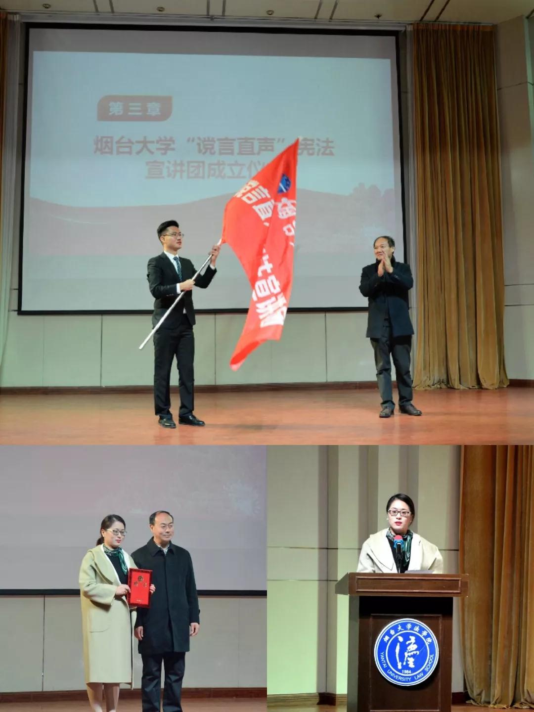 随后,主持人向大家介绍了“谠言直声”宪法宣讲团,这是一个以增强全校师生法治观念,推动全校树立宪法意识为目的创办的学生自我宣传教育组织。同时,宣布宪法宣讲团成立仪式正式开始,由校党委宣传部部长于秀国老师为宣讲团授旗,党委学工部部长赵利江老师为宣讲团指导老师崔雪丽老师颁发聘书,校团委书记朱兴老师为宣讲团成员授予绶带、颁发聘书。