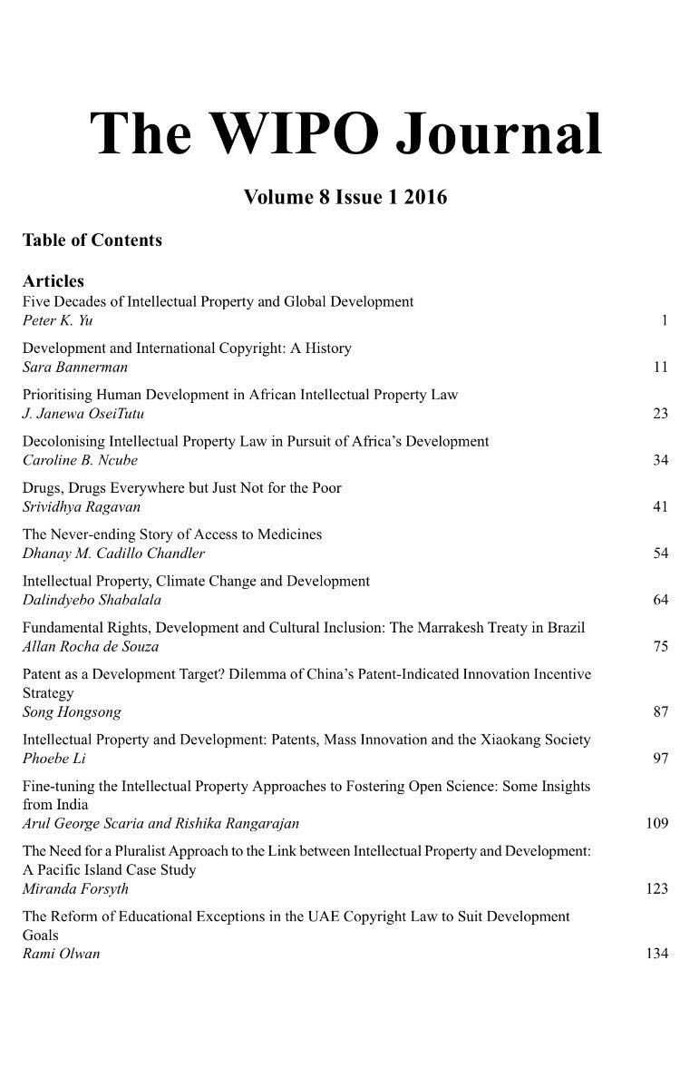 本期《世界知识产权学刊》的主题为“知识产权与发展”。来自美国、加拿大、南非、芬兰、荷兰、巴西、中国、英国、印度、澳大利亚以及阿联酋等国的十三位学者分别就知识产权与人权、知识产权与去殖民化、知识产权与气候变化、知识产权与文化包容、知识产权与创新激励、知识产权与药物获取、知识产权与多样性、知识产权与开放研究、知识产权与教育等与发展相关的知识产权问题进行了探讨。
