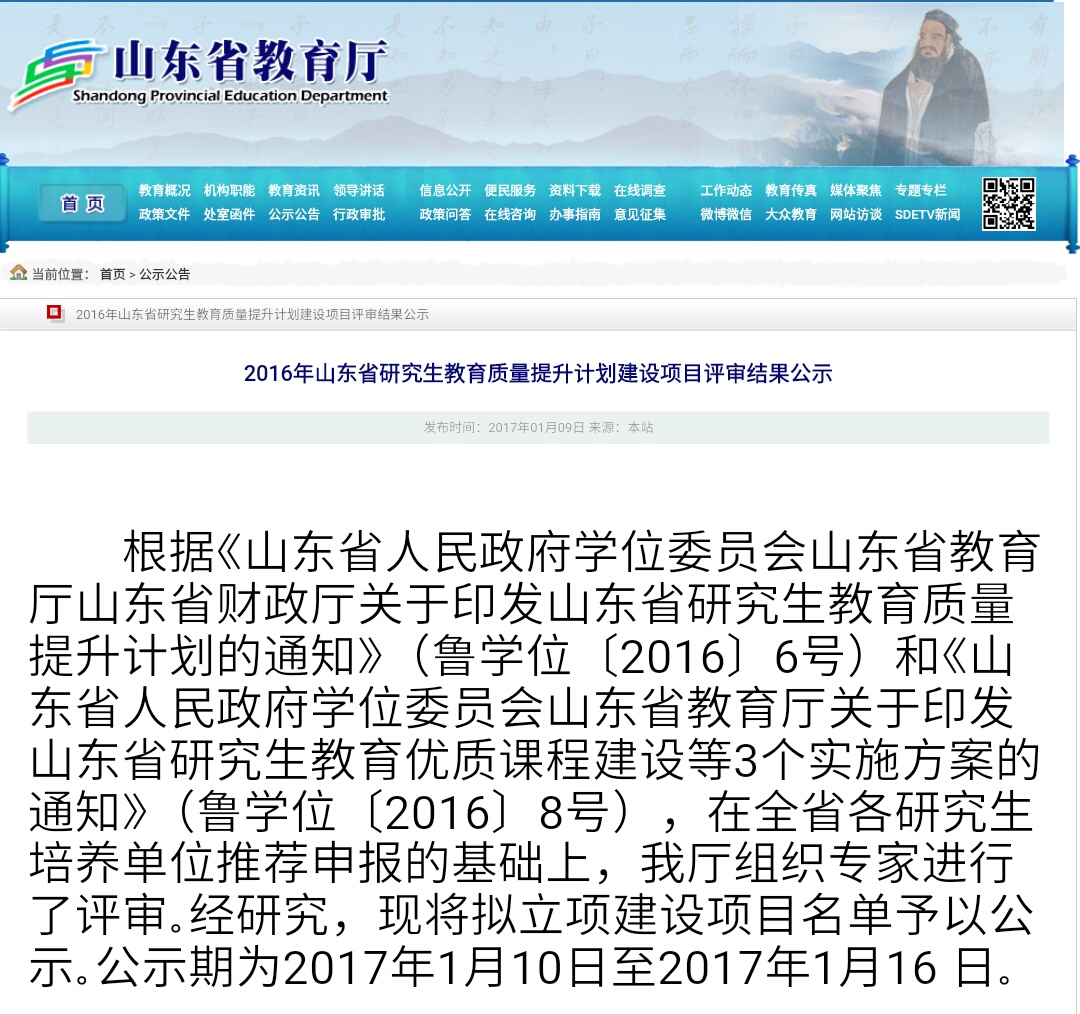 根据《山东省人民政府学位委员会山东省教育厅山东省财政厅关于印发山东省研究生教育质量提升计划的通知(鲁学位〔2016〕6号)和《山东省人民政府学位委员会山东省教育厅关于印发山东省研究生教育优质课程建设等3个实施方案的通知》(鲁学位〔2016〕8号),我省启动了“山东省研究生教育优质课程”、“ 山东省专业学位研究生教学案例库”和“山东省研究生教育联合培养基地”评选工作。近日,在全省各研究生培养单位推荐申报的基础上,山东省教育厅组织专家进行了评审,尼克成人网