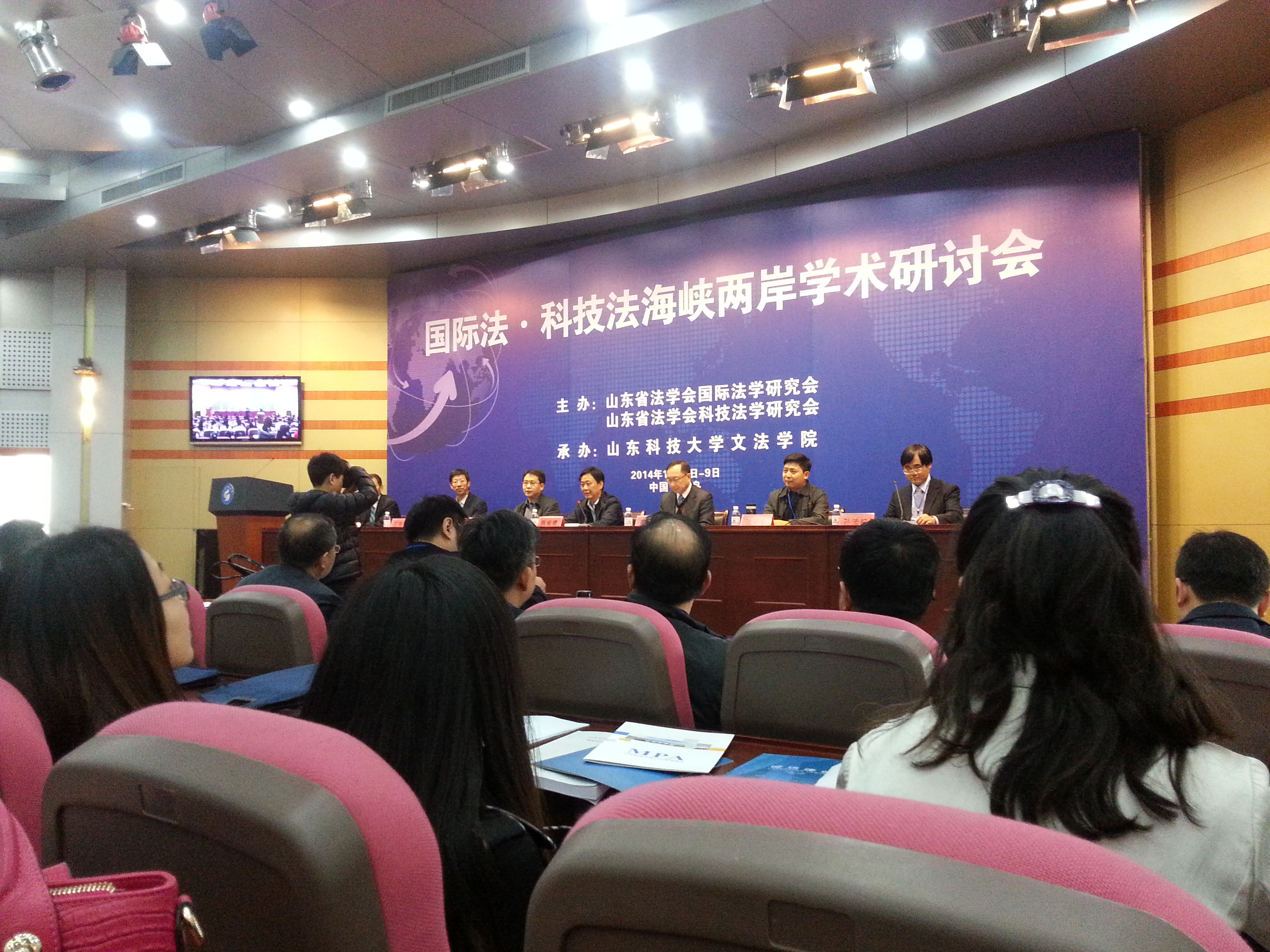 的倡议下,举行了以“国际法·科技法海峡两岸研讨会”为题的、三会合一的、别开生面的开幕式。此次年会共有来自15个省内高校、科研院所、法院、海关、仲裁机构的40余名专家学者和研究生参与盛会。本次年会围绕海峡两岸贸易协议法律问题、山东蓝黄经济区建设中的国际法问题、中国自由贸易区法律问题、中国海洋权益维护的国际法律问题、.知识产权的国际保护与应对法律问题、涉外民事关系法律适用问题的理论与实践、海商法的相关理论与实践问题以及国际法基本理论问题等八个主题进行了热烈的讨论。与会人员彼此深入的交换了意见,在和谐而又不失严谨的学术碰撞中产生了思想的火花。