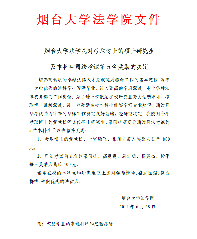 对考取博士的硕士研究生及本科生司法考试前五名奖励的决定