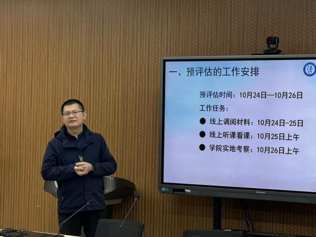 院长助理王超政详细介绍了预评估的工作安排及注意事项以及教育教学规范、教学秩序、评估参考内容和材料整理归档等方面的内容,对迎评工作要求做出详细介绍。