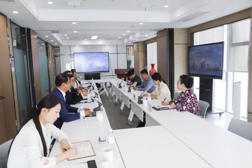 在锦天城(青岛)律师事务所,律所主任、管委会主任贾小宁,党委书记尚素玉,执行主任袁伟,管委会成员毛国锋,监事会成员张毅,行政陈洋参与座谈并组织参观。
