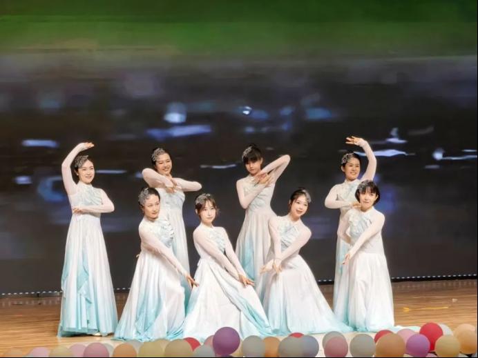女教师们为大家带来舞蹈表演《一路生花》。老师们随着音乐优雅起舞,这不仅是桃李芬芳的一路生花,也是对毕业生们未来的祝福。舞蹈后,同学们给老师献花,老师们共同祝福2025届毕业生毕业快乐。