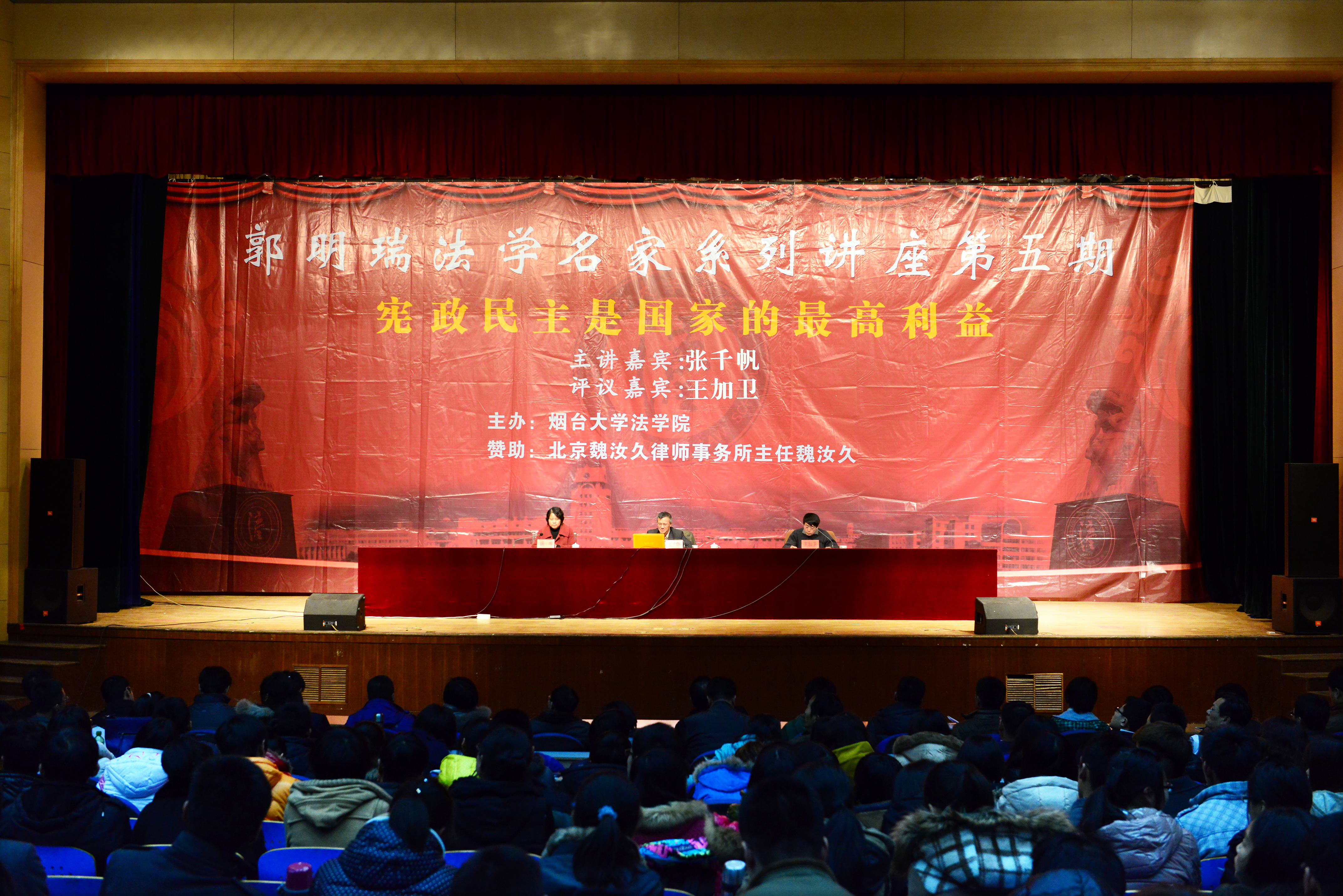 王加卫教授从博弈论、系统论、控制论、模型论等宪法研究方法的角度对讲座进行了精彩的点评,张千帆教授就现场学子的提问进行了耐心细致的解答。最后汤唯教授对整场讲座进行总结说:“论法治学,感悟反思预警;理性评判,制度自由德行;实现宪政,扬我中华之魂;百家争鸣,信仰自在于心。”话语机智幽默的讲座历时近3个小时,现场听众用雷鸣般的掌声表达了他们的意犹未尽。相信每位聆听者都能以此讲座为思考的源头,探索自己关于宪政、民主、自由和信仰的答案。