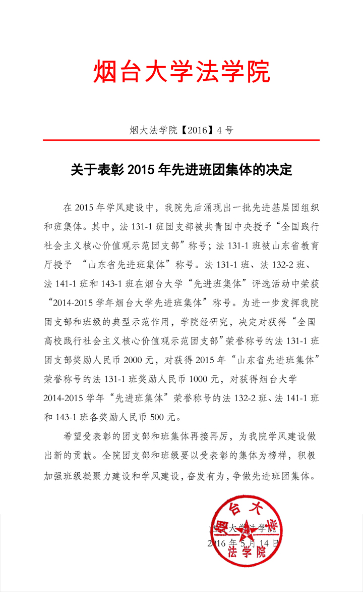 烟大尼克成人网 【2016】4号关于表彰2015年先进班团集体的决定