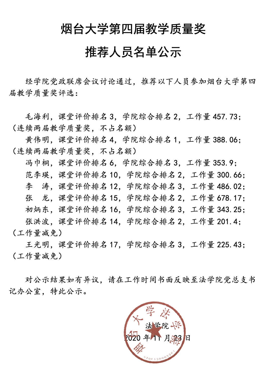 尼克成人网 第四届教学质量奖推荐人员名单公示