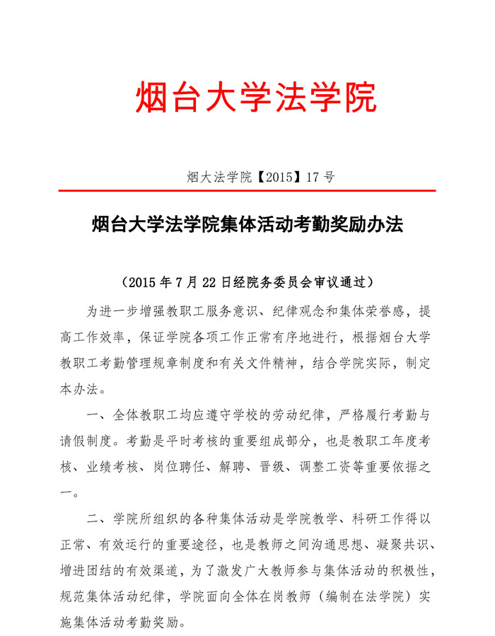烟大尼克成人网 【2015】17号尼克成人网 集体活动考勤奖励办法