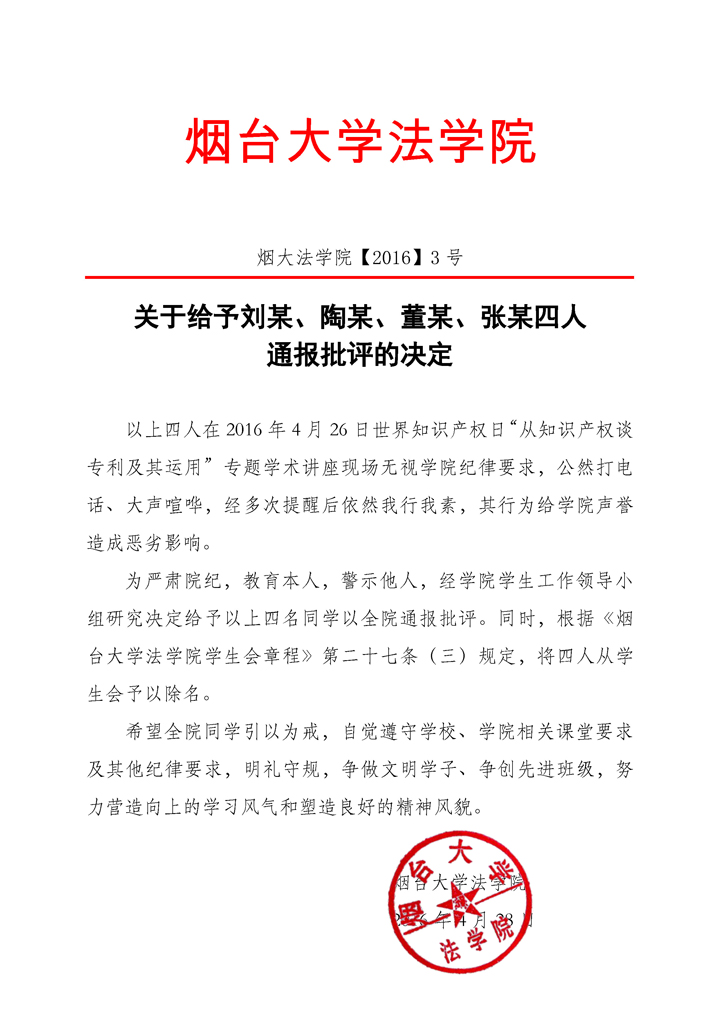 烟大尼克成人网 【2016】3号关于给予四名学生通报批评的决定