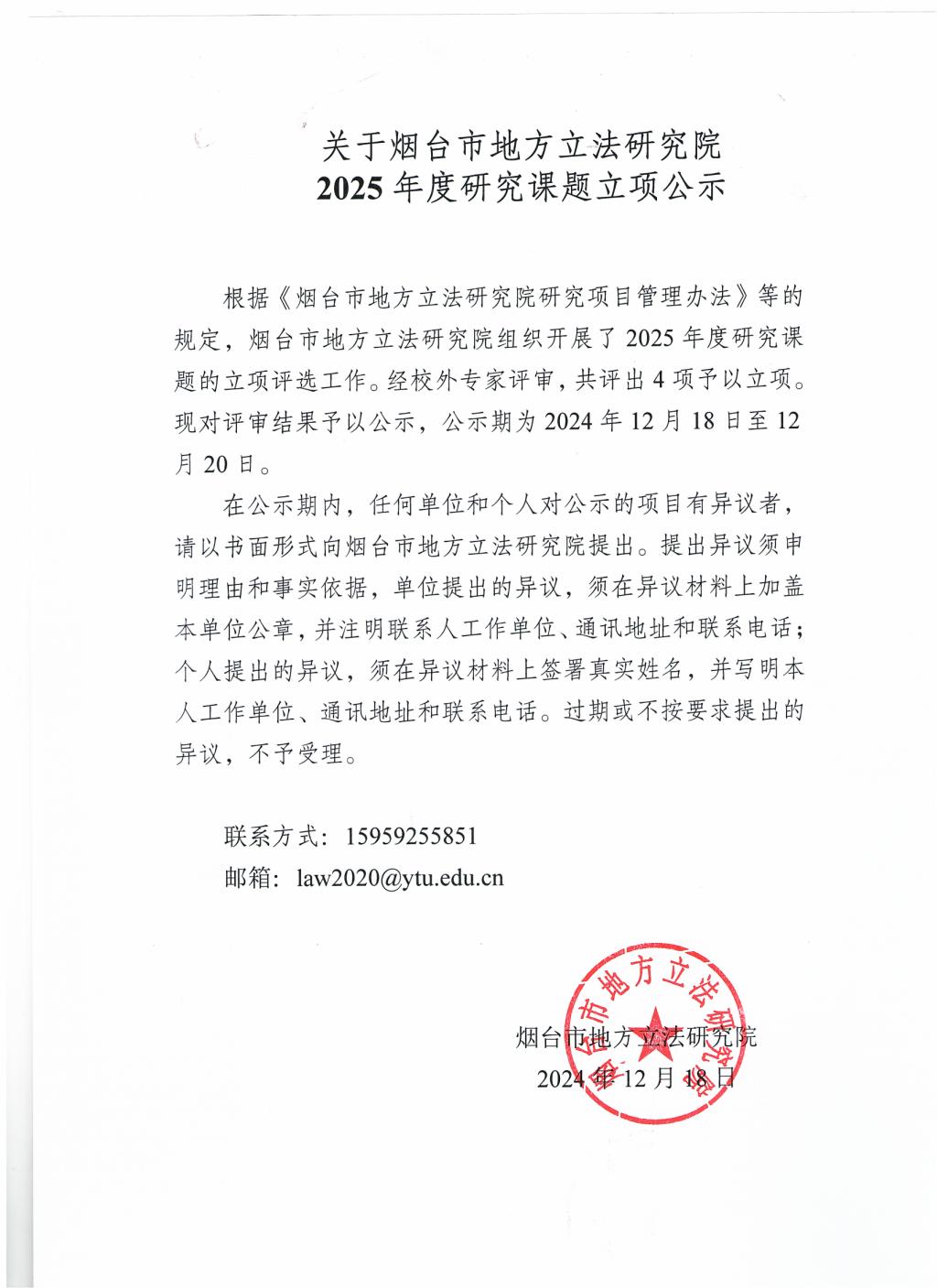 关于烟台市地方立法研究院2025年度研究课题立项公示